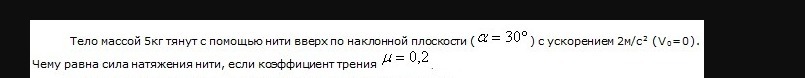 Fтяг=mg*sina+ma+kmgcоsa=5*10*0,5+5*o,2+0,2*5*10*0,866=34,66 Н