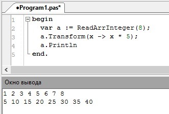 Введите массив, состоящий из 8 элементов. Увеличьте значение элементов массива в 5 раз. Выведите массив.