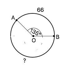 На окружности с центром О отмечены точки А и В так,что угол АОВ=135 градусов. Длина меньшей дуги AB равна 66. Найдите длину большей дуги.