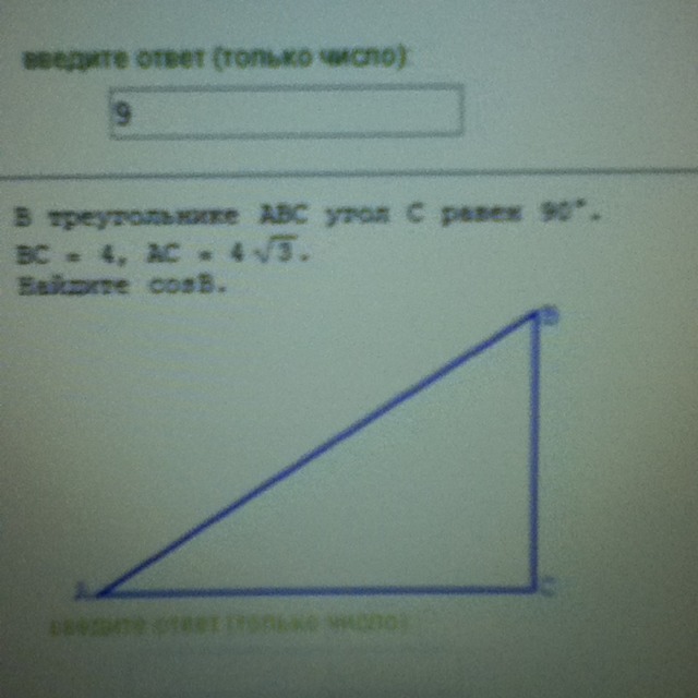 CosВ = СВ/АВ ( косинус угла есть отношение прилежащего катета к гиротенузе).