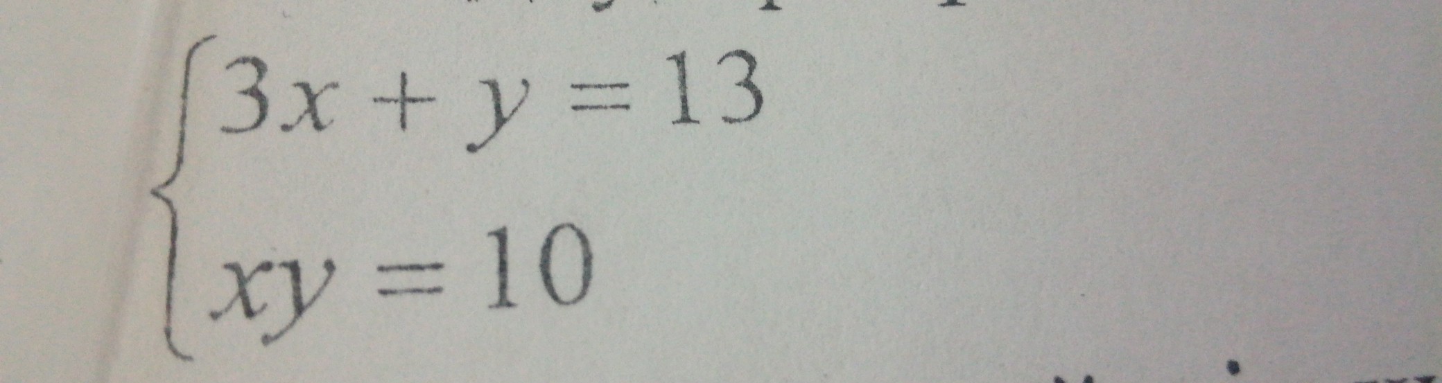 y=13-3x. подставляем во 2 уравнение: x*(13-3x)=10; -3x^2+13x-10=0; D=13^2-4*(-3)*(-10)=169-120=49; x1=(-13-7)/(-6), x2=(-13+7)/(-6). x1=20/6, x2= 1. y1=13-3*20/6=13-10=3, y2=13-3*1=13-3=10. Ответ:( 20/6; 3), (1:10).