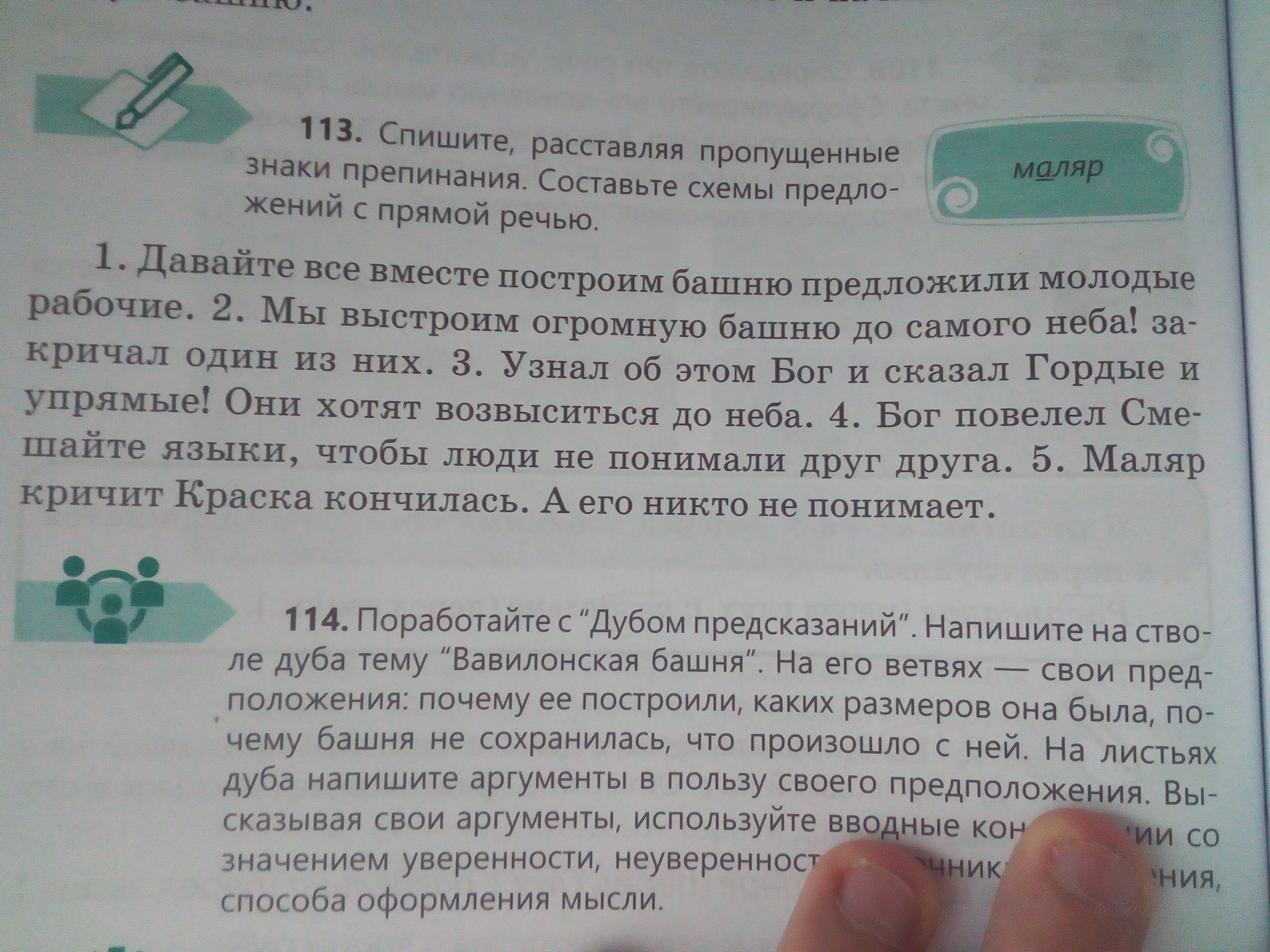 1. " Давайте все вместе построим башню", - предложили молодые рабочие. Схема -- " П ", - а. 2. " Мы выстроим огромную башню до самого неба!" - закричал один из них. Схема -- " П ! " - а. 3. Узнал об этом Бог и сказал: " Гордые и упрямые! Они хотят возвыситься до неба. " Схема -- А : " П ! " 4. Бог повелел: " смешайте языки,чтобы люди не понимали друг друга ". Схема -- А : " П " . 5. Маляр кричит : " Краска кончилась!" - а его никто не понимает. Схема -- А : " П ! " - а.