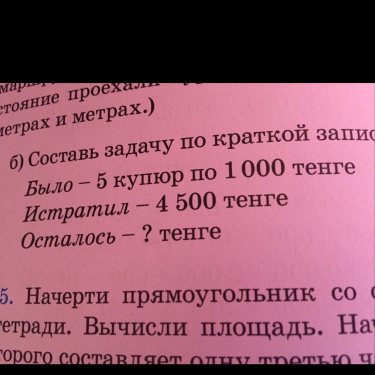 Девочка пошла в магазин с пятью купюрами по 1000 тенге. Купив одежды она истратила 4500 тенге. Сколько у неё осталось денег для того, чтобы купить перекусить?