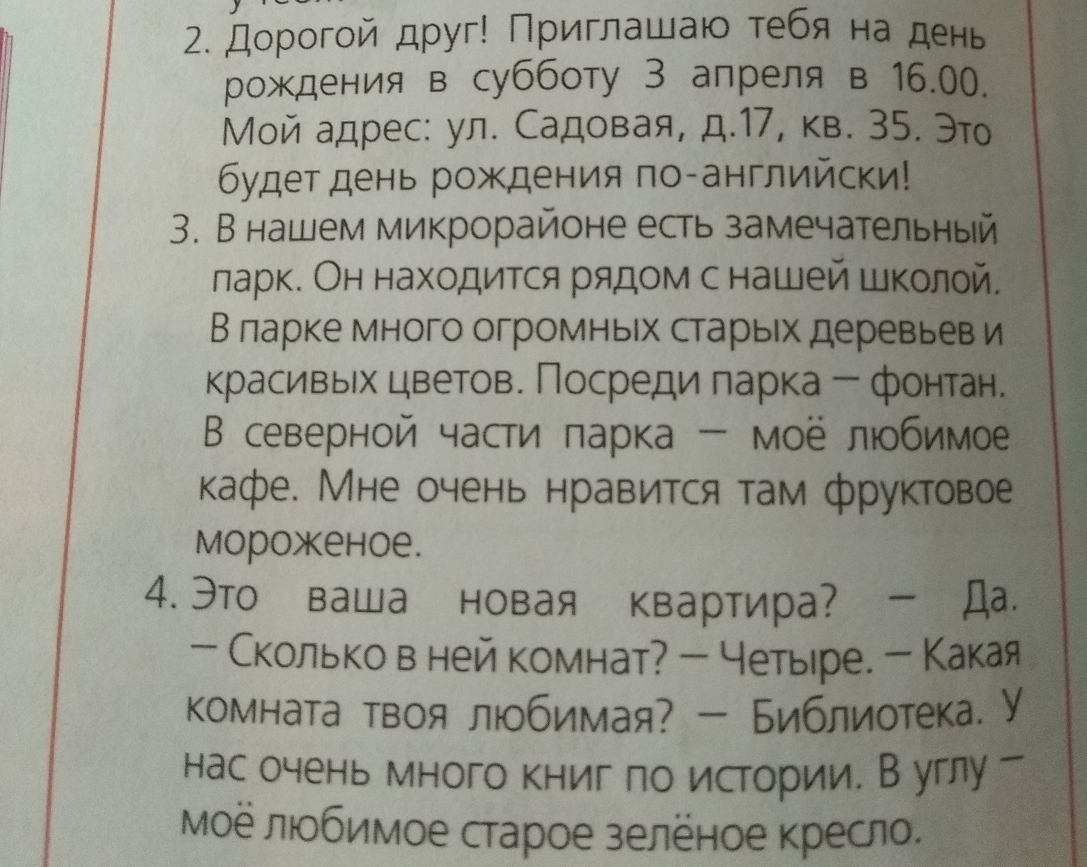 3. There is a wonderful park in our neighbourhood. It is near our school. There are a lot of big old trees and beautiful flowers in the park. There is a fountain in the middle of the park. In the northern part of the park there is my favourite cafe. I like fruit ice-cream there very much.