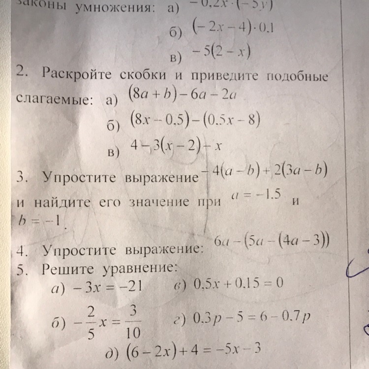 1)-3x=-21 \x=7\\2)-frac{2}{5} x=frac{3}{10} |*frac{5}{2} \x=-frac{3}{4} \x=-0.75\\3)0.5x+0.15=0\0.5x=-0.15\x=-0.3\\4) 0.3p-5=6-0.7p\0.3p+0.7p=6+5\x=11\\5)(6-2x)+4=-5x-3\6-2x+4=-5x-3\10-2x=-5x-3\-2x+5x=-3-10\3x=-13\x=-frac{13}{3}