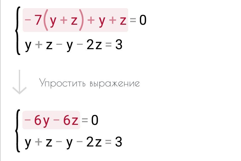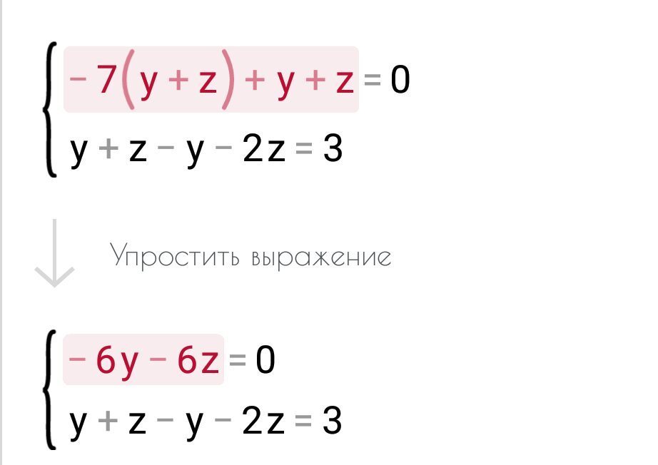 Второе уравнение X=y+z вставляем в первое -7x+y+z=0. И получаем -7(y+z)+y+z=0