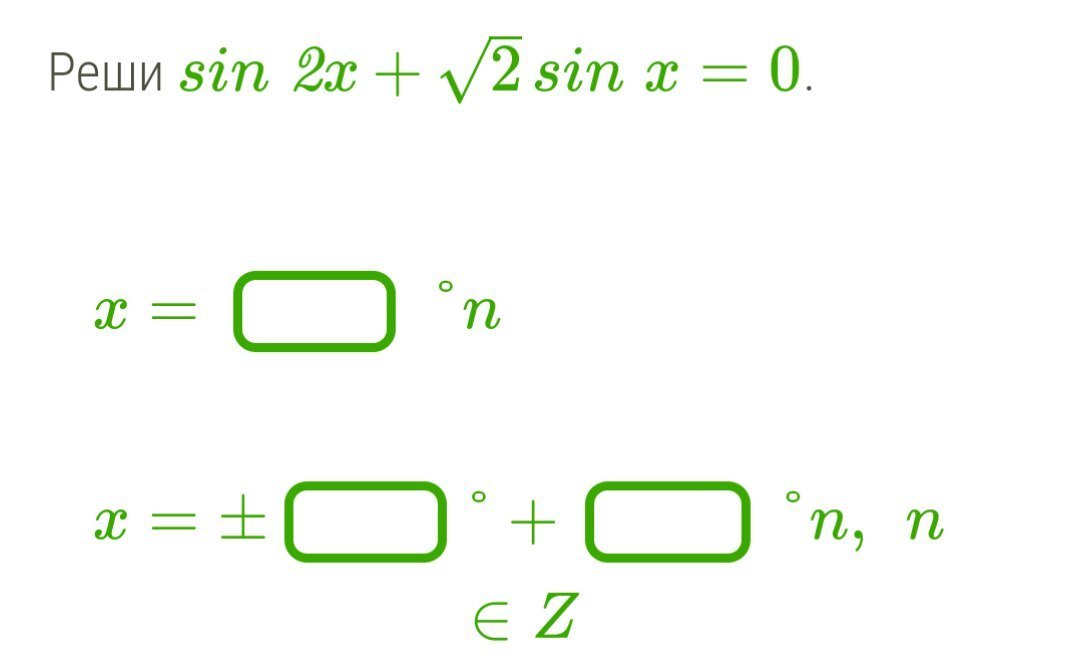 [ sinx =0 ; cosx = -√2) /2 .⇔ [ x = 180°n ; x =± 135° +360°n , n ∈ Z.