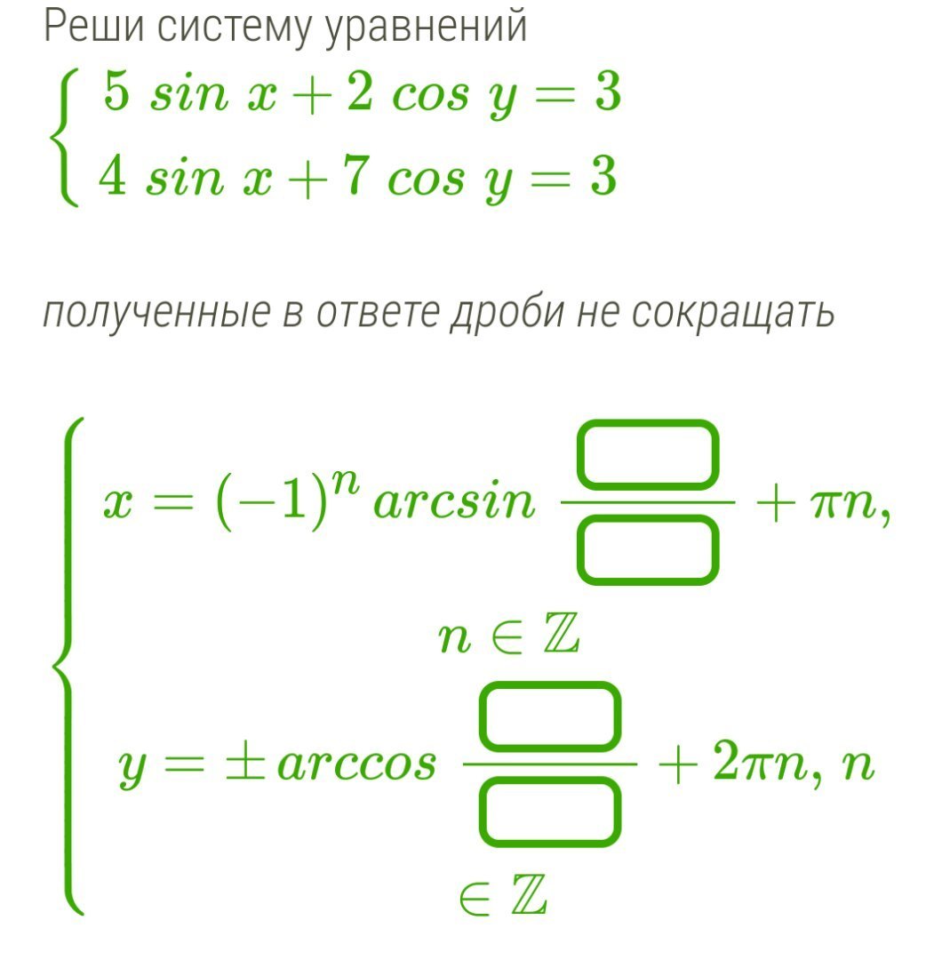 { 5*5cosy + 2cosy = 3 ; sinx = 5cosy . ⇔{ cosy =1/9 ; sinx = 5/9 .⇔