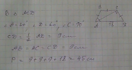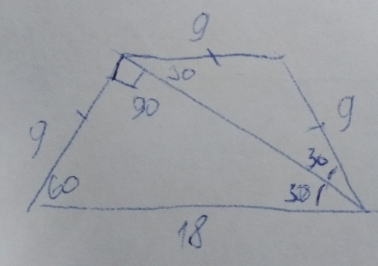 Второй же теугольник у нас получается равнобедренный. Т.к. тупые углы в трапеции равны (360-2*60)/2=120°, а 90° из 120 отъел первый треугольник. У нас получился треугольник с углами по 30° при основании и 120° в вершине. А если он равнобедренный, то и его стороны при равных углах равны, получаем, что верхнее основание равно 9, а периметр будет 9+9+9+18=45