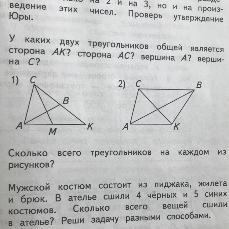 У каких двух треугольников общей является сторона АК?сторона АС?вершина А?вершина С?Сколько всего треугольников на каждом из рисунков?