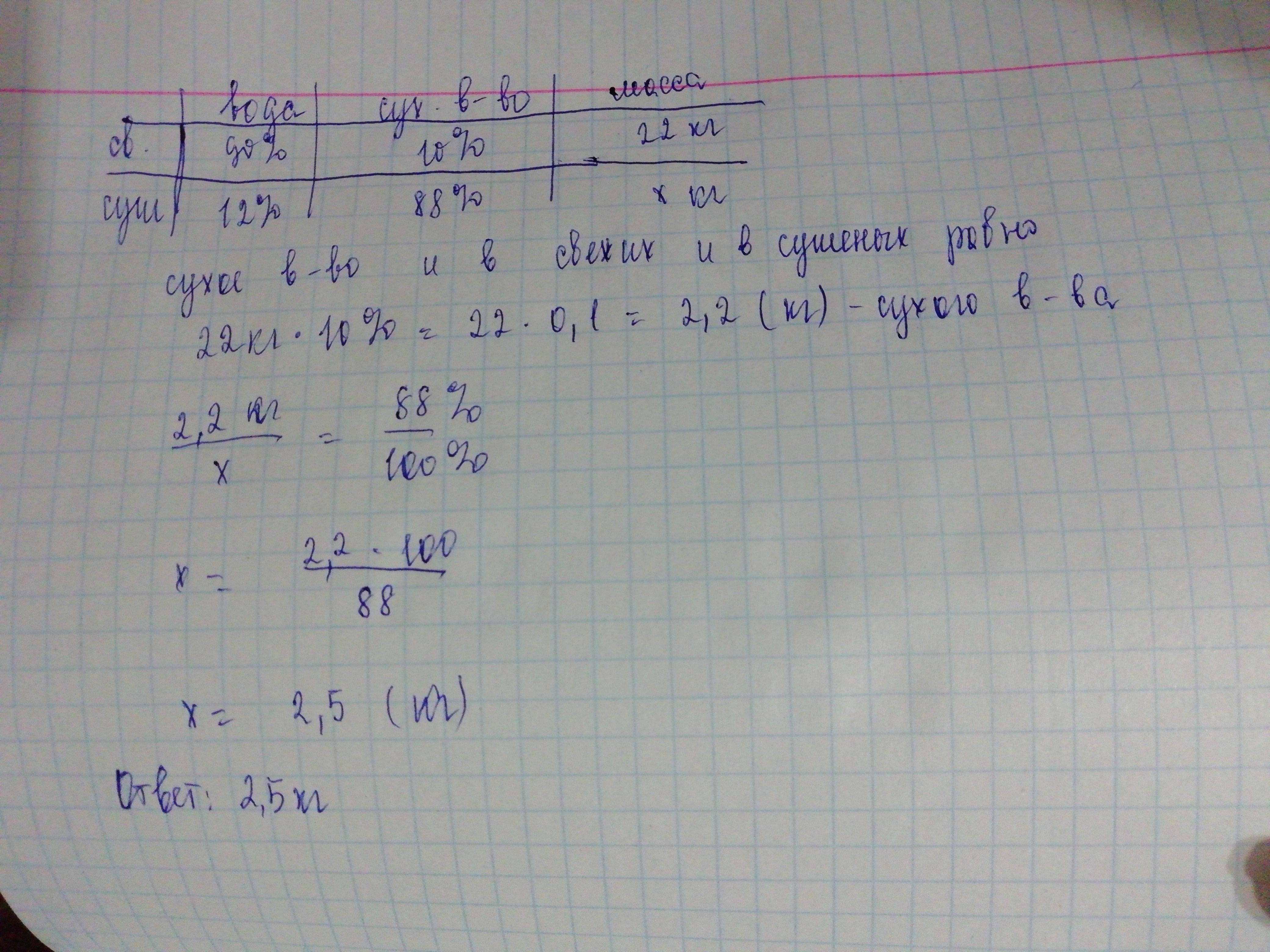 Количество воды составляет 90% и 12%-у свежих и высушенных грибов соответственно Сколько кг можно получить сушеных грибов из 22 кг свежих грибов?