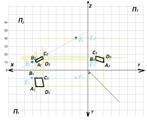 Чтобы не искать координаты точек C и D, достаточно отложить от точки В длину стороны квадрата 10,28 на фронтальной плоскости. Так как ВС║XOZ, то проекция длины квадрата на фронтальную плоскость будет равна длине квадрата. Отложить можно в обе стороны. Возможно 2 варианта построения. В приложении дан чертёж для случая, когда точки C и D расположены к центру координат от точек A и B.