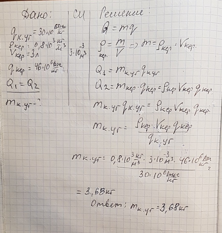 Какое количество каменного угля необходимо сжечь чтобы получить такое же количество теплоты как и при сгорании 3 л керосина.