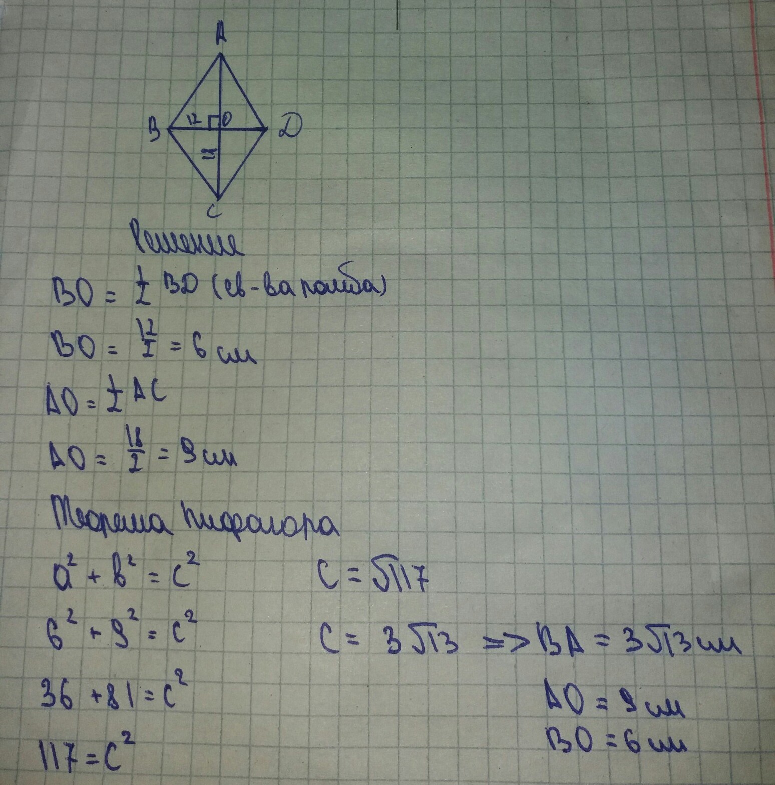 РЕБЯТ помогите прошу вас....... в РОМБЕ ПРОВЕДЕНЫ ДОИГОНАЛИ НАЙДИТЕ БОК СТОРОНЫ ЭТИХ ТРЕУГОЛЬНИКОВ ЕСЛИ ДИОГ 12СМ И 18СМ помогите пожалуйста