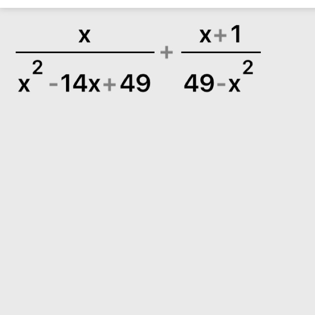 frac{x}{(x-7)(x-7)}-frac{x+1}{(x-7)(x+7)}=frac{x(x+7)}{(x-7)(x-7)(x+7)}-frac{(x+1)(x-7)}{(x-7)(x-7)(x+7)}=frac{x^2+7x-(x^2-6x-7)}{(x-7)(x^2-49)}=frac{13x+7}{x^3-49x-7x^2+1323}=