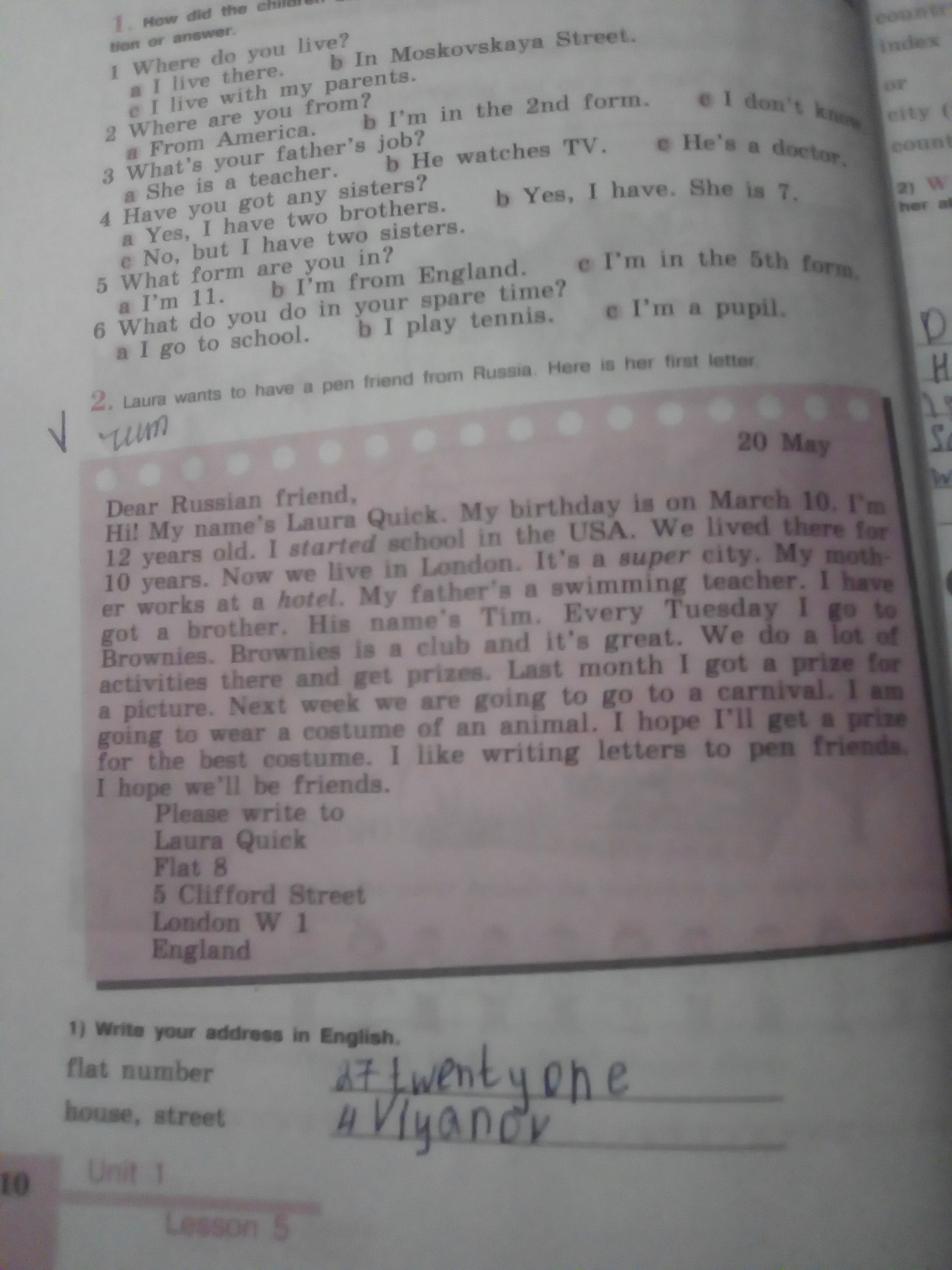 Уважаемый российский друг, привет! Меня зовут Лора Бек. Мой день рождения на Mareh 10 T 12 лет. Я начал учиться в США. Мы жили там годами. Теперь мы живем в Лондоне. Это супер-город. Моя моль работает в отеле. Мой отец учитель плавания. Я брат, его зовут Тим. Вторник I g Browni es. Домовые - это клуб, и это здорово. Мы проводим там много мероприятий и получаем призы. В прошлом месяце я получил приз за пирот. На следующей неделе мы отправимся на карнавал. Я должен носить костюм анимы для лучшего сотрудничества. Мне нравится писать письма в pen friemd l. Надеюсь, я получу награду, и мы будем друзьями. Пожалуйста, напишите Laura Quick Flat 8 5 Clifford Street London W I England