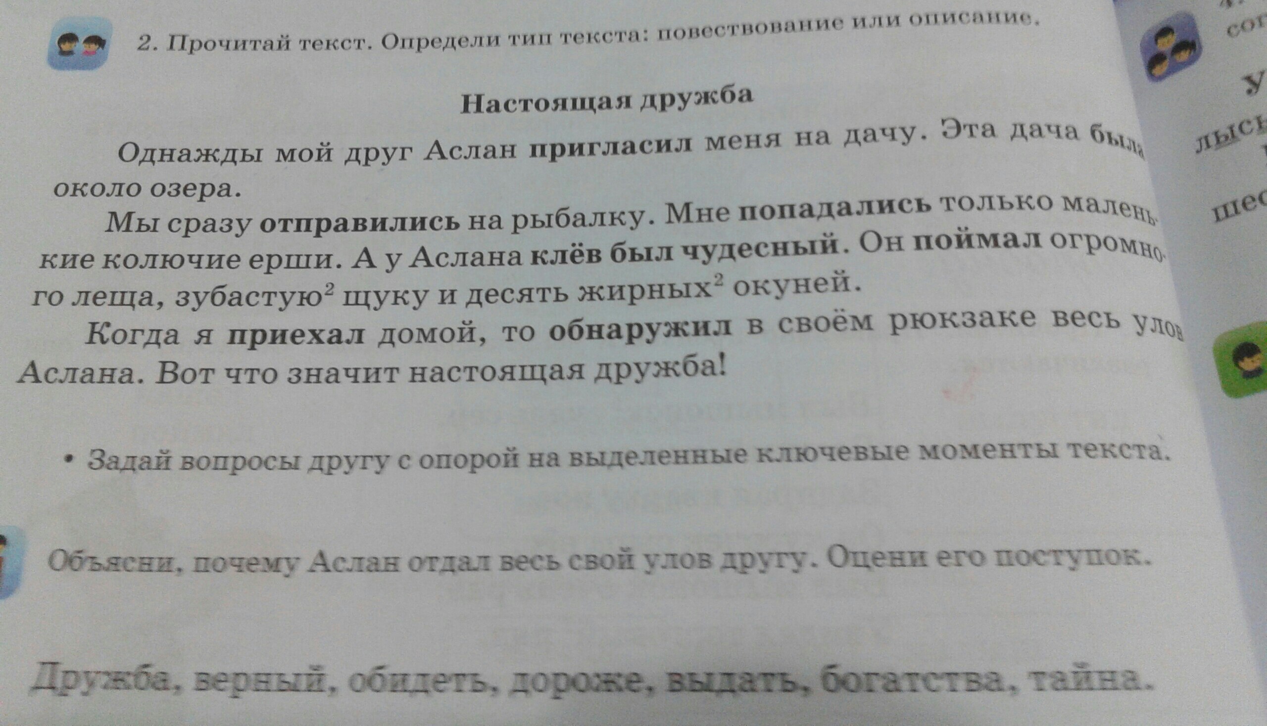 Аслан - настоящий друг. Мальчик заметил, что у приятеля не идёт рыбалка, что он огорчён, и решил тайно порадовать его: переложил в рюкзак друга весь свой улов. Дружба дороже всякого богатства!