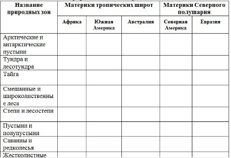 используя карту географических поясов и природных зон определите какие природные зоны сформировались на каждом из материков. Обозначте в таблице + наличие природной зоны и матирике