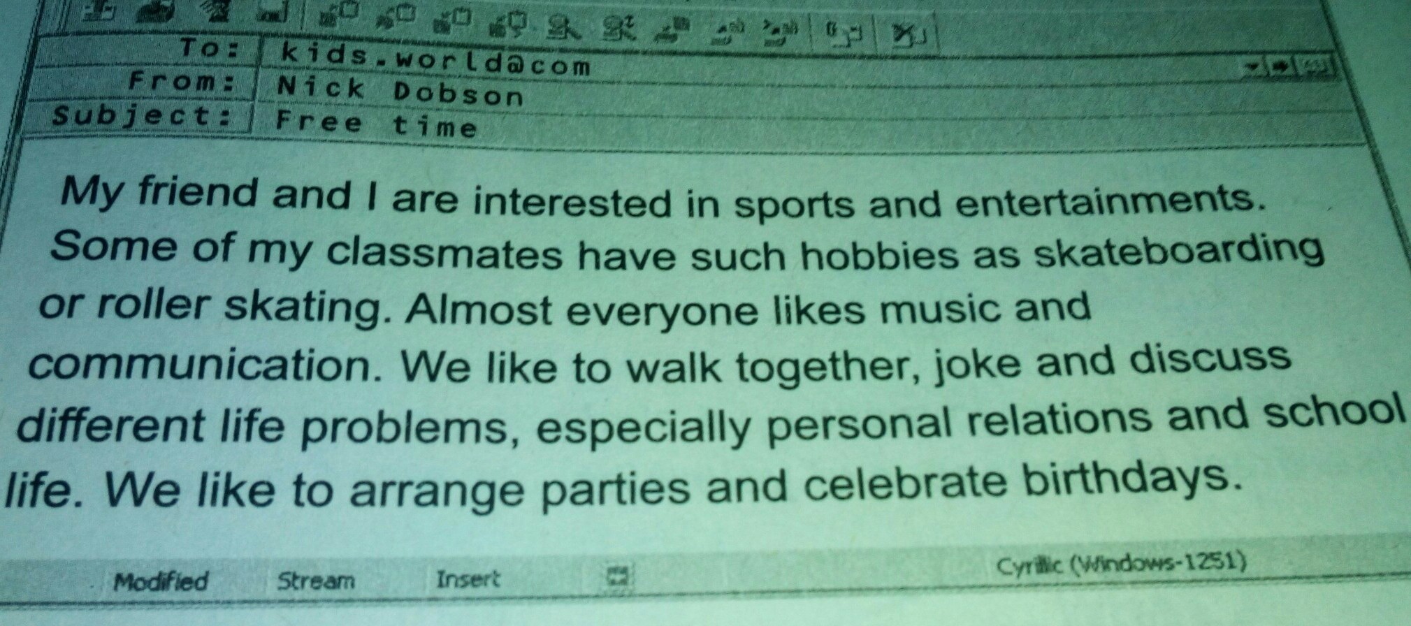 Мой друг и я интересуемся спортом и развлечениями. У некоторых моих одноклассников есть такие увлечения, как скейтбординг или катание на роликах. Почти всем нравится музыка и общение. Нам нравится ходить вместе, шутить и обсуждать различные жизненные проблемы, особенно личные отношения и школьную жизнь. Нам нравится устраивать вечеринки и праздновать дни рождения.