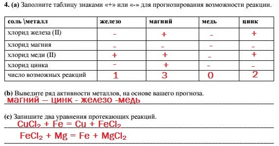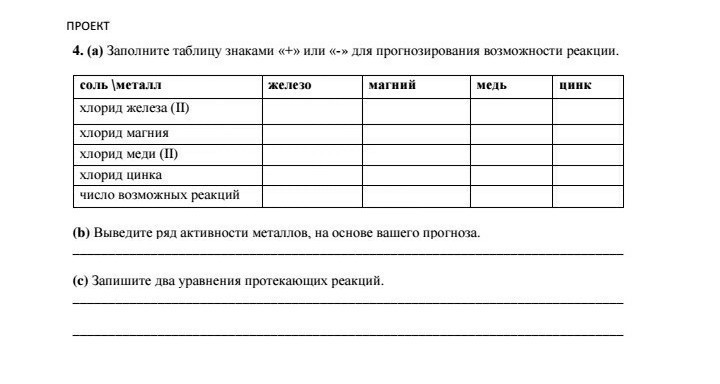 (а) Заполните таблицу знаками «+» или «-» для прогнозирования возможности реакции b) Выведите ряд активности металлов, на основе вашего прогноза. ______________________________________________________________________________