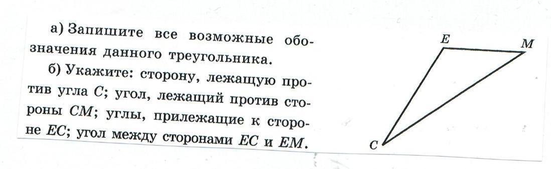 б) против /_ С лежит сторона ЕМ, против СМ лежит /_ Е, /_ЕСМ и /_ЧЕМ принадлежат ЕС. /_Е лежит между сторонами ЕС и ЕМ