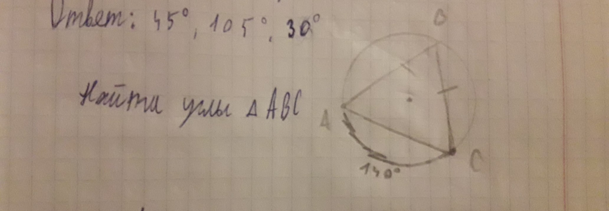 Сначало находим дуги.Так как треугольник имеет две ровные стороны то и дуги ровны. (360-140):2=110 110:2=55- A=C 180-110=70-B Или