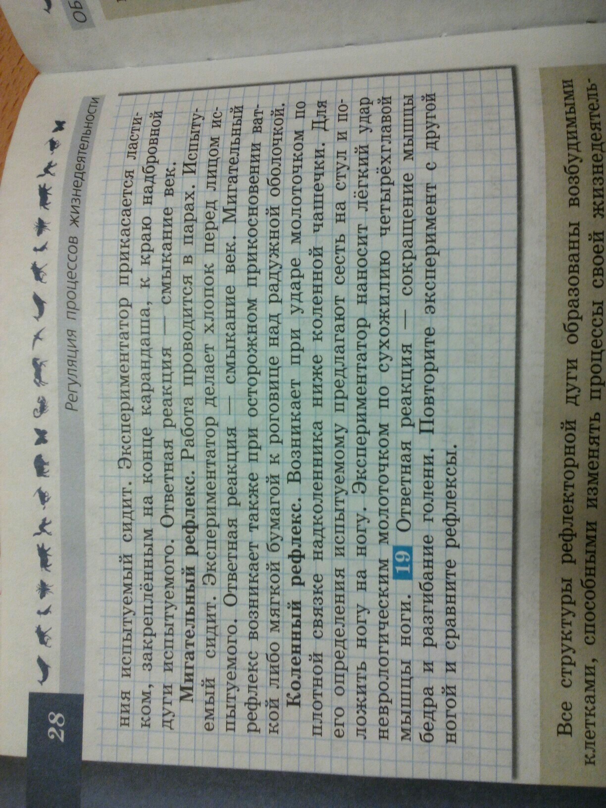 сначала на коленку мы получаем вот например удар молоточка, этот удар действует на рецептор(раздражает), от рецептора по волокну импульс доставляется к телу чувствительного нейрона, этот чувствительный нейрон идет в спинной мозг где чувствительный нейрон передает импульс вставочному нейрону( но не всегда присутствует вставочный нейрон), потом этот вставочный нейрон из спинного мозга передает импульс двигательному нейрону, ну а потом этот двигательный нейрон поступает в мышцу и изменяет деятельность рабочего органа(т.е. наша нога при ударе молоточка вздрагивает).Это все происходит ооочень очень быстро. Вроде так)