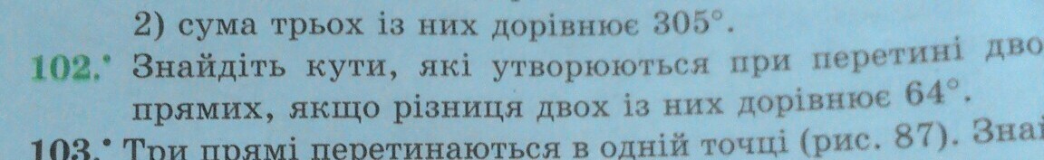 При пересечении двух прямых образуются вертикальные углы, сумма которых равна 180 °. Пусть один из углов x, тогда второй будет x + 64. Если их сумма 180 °, составим и решим уравнение: x+x+64= 180 2x= 116 x= 58°. (Меньший угол) Тогда второй угол будет или 58 + 64 = 122 или 180-58 = 122 °