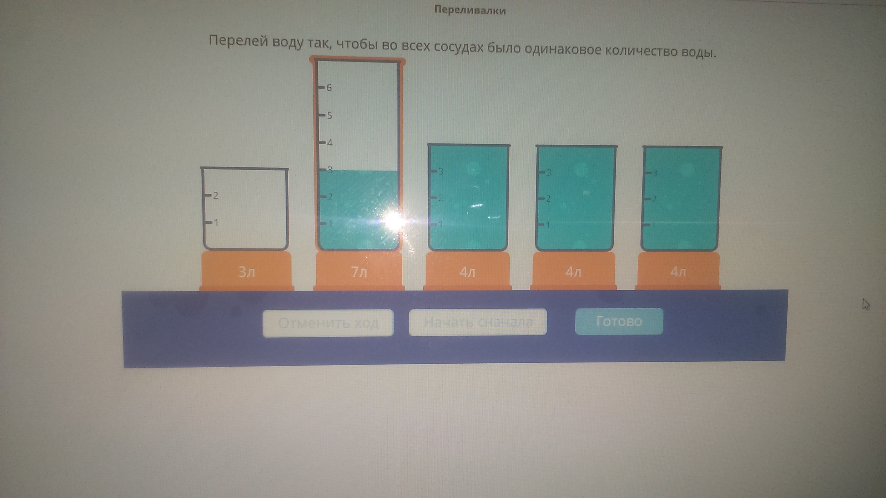 надо разлить по 5 мензуркам одинаково 15 : 5 = 3 литра