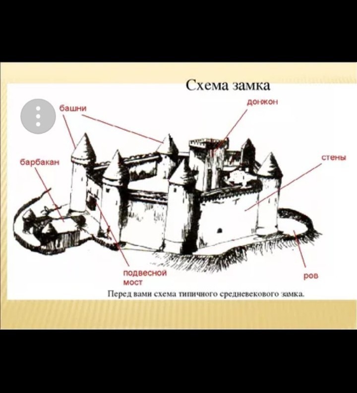 Средневековый замок: 1. Донжон - самое большое здание, расположенное в центре замка. Его внешние стены когда-то были выбелены так, что слепили глаза. 2. Каменные стены. В некоторых замках можно найти следы красок на штукатурке внутренних стен. Некогда штукатурка была покрыта пёстрыми рисунками или скрывалась за гобеленами. 3. Надвратная башня. Ложбинки в стенах у ворот указывают место опускавшейся и поднимавшейся решётки. Она скользила по ложбинкам и закрывала вход. За ней была пара тяжёлых ворот. 4. Камины. 5. Часовня. 6. Стенные укрепления. В военное время в них крепились балки, поддерживавшие деревянные галереи. 7. Винтовая лестница. Всегда поворачивала направо. Вражеский рыцарь. пробивавшийся наверх, держа меч в правой руке, лишался пространства для замаха. 8. Ров. Заполнялся водой, удерживавшей неприятеля на почтительном расстоянии.