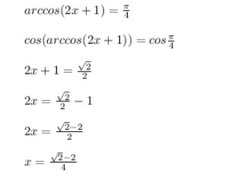 arccos(2x+1)=frac{pi }{4}\\cos(arccos(2x+1))=cosfrac{pi}{4}\\2x+1=frac{sqrt2}{2}\\2x=frac{sqrt2}{2}-1\\2x=frac{sqrt2-2}{2}\\x=frac{sqrt2-2}{4}