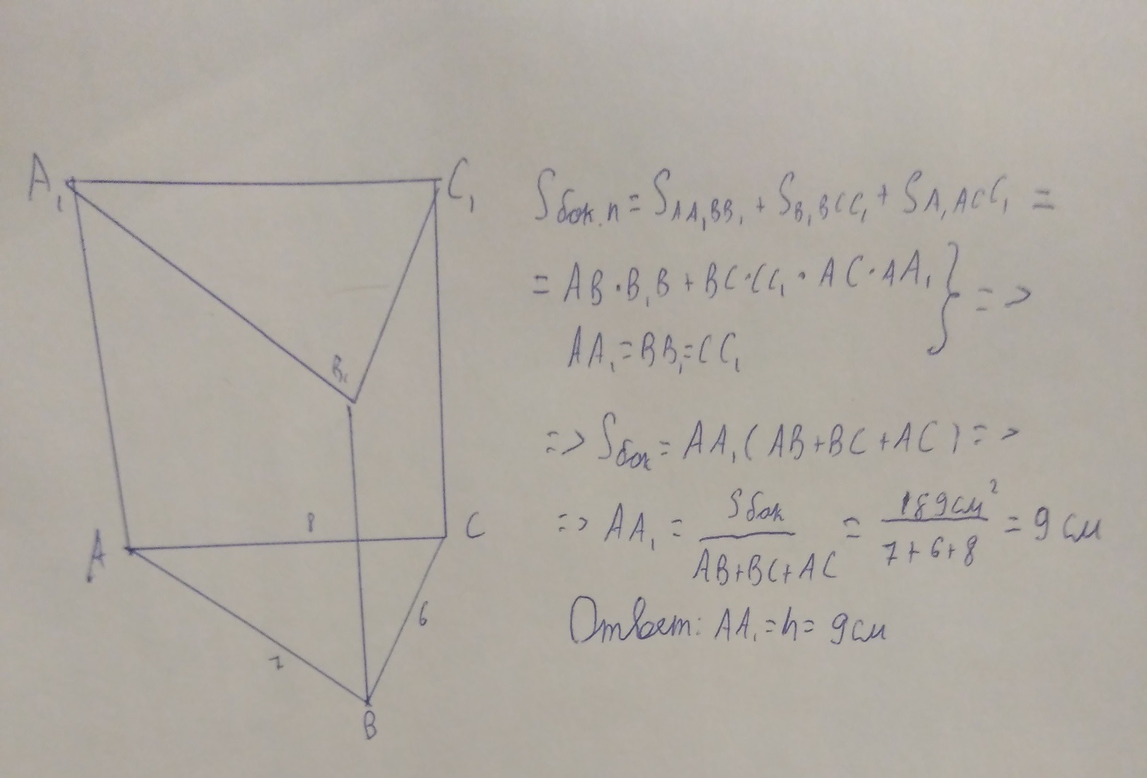 основой прямоугольной призмы является треугольник длины сторон которой 6см 7см 8 см. какой может быть высота призмы если площадь ее боковой поверхности меньше 189 см^2