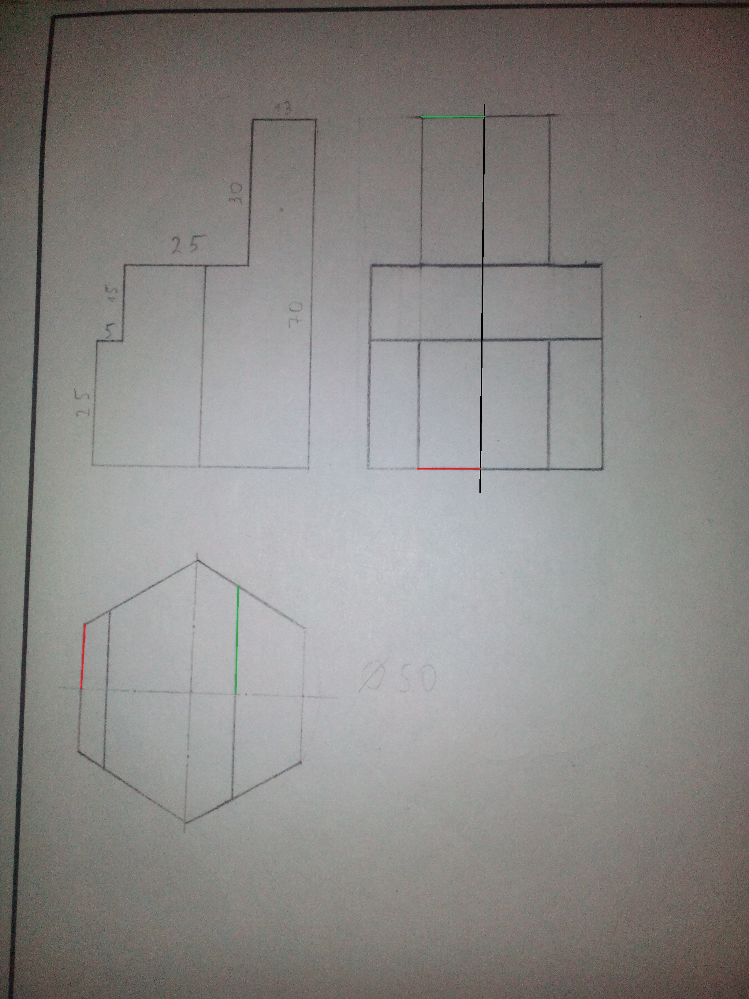 Инженерная графика. Дана фигура с видом спереди и видом сверху. Начертите фигуру с видом слева ( у меня начато, но не думаю, что правильно).