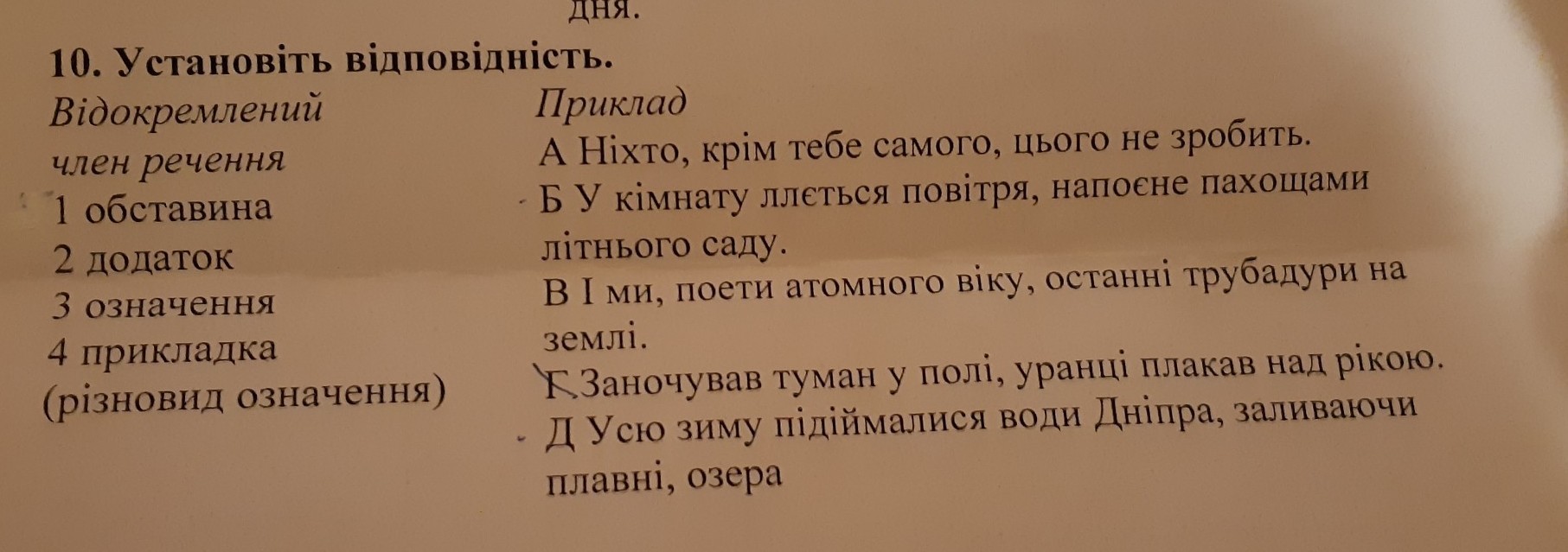 1д, ( заливаючи плавні) 2а, ( крім тебе самого)3б,( напоєне пахощами літнього саду) 4в, ( поети атомного віку)