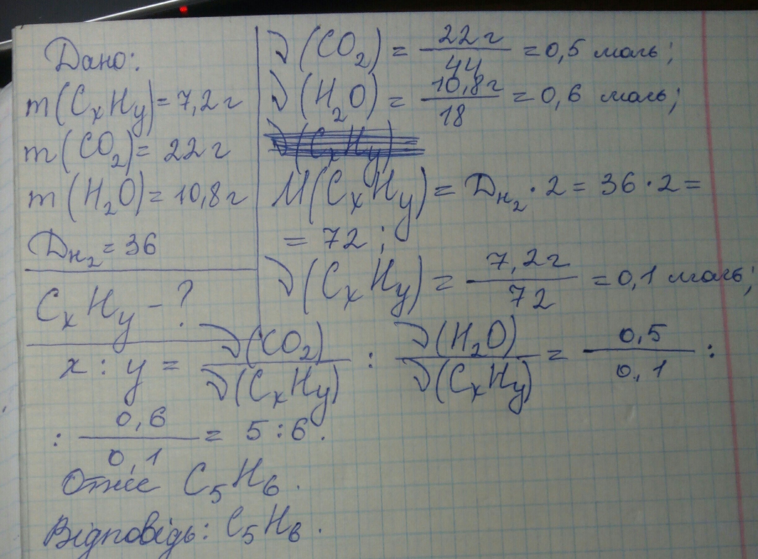 У результаті спалювання 7,2г органічної сполуки, утворилося 22г Вуглекислого газу і 10,8г води, визначити формулу, якщо відносна густина за воднем дорівнює 36....Помогите плииски.34 Бала