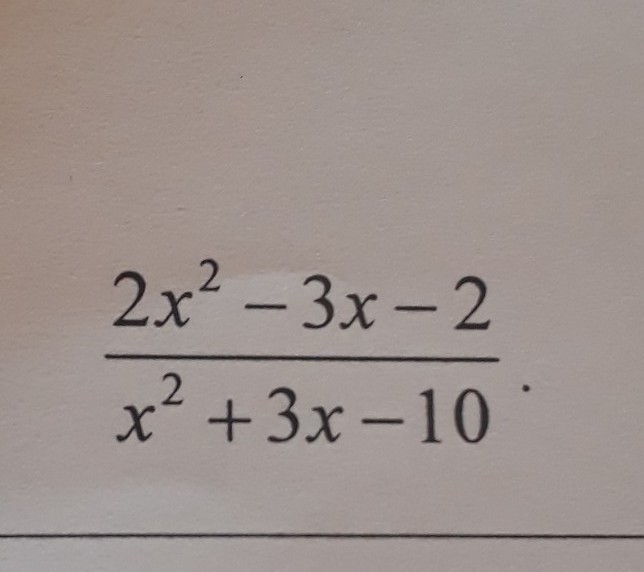 frac{2x {}^{2} - 3x - 2 }{x {}^{2}  + 3x - 10}  \  \  frac{2x {}^{2}  + x - 4x - 2}{x {}^{2}  +5x - 2x - 10}  \  \  frac{x times (2x + 1) - 2(2x + 1)}{x times (x + 5) - 2(x + 5)}  \  \  frac{(2x + 1) times (x - 2)}{(x + 5) times (x - 2)}  \  \  frac{2x + 1}{x + 5}