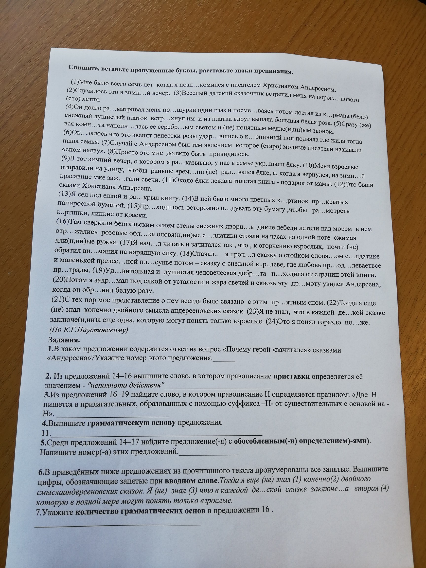 (1)Мне было всего семь лет, когда я познакомился с писателем Христианом Андерсеном.(2)Случилось это в зимний вечер, всего за несколько часов до наступления двадцатого столетия. (3)Веселый датский сказочник встретил меня на пороге нового века.(4)Он долго рассматривал меня, прищурив один глаз и посмеиваясь, потом достал из кармана белоснежный душистый платок, встряхнул им, и из платка вдруг выпала большая белая роза. (5)Сразу же вся комната наполнилась ее серебряным светом и непонятным медленным звоном. (6)Оказалось, что это звенят лепестки розы, ударившись о кирпичный пол подвала, где жила тогда наша семья.(7)Случай с Андерсеном был тем явлением, которое старомодные писатели называли «сном наяву». (8)Просто это мне, должно быть, привиделось.(9)В тот зимний вечер, о котором я рассказываю, у нас в семье украшали елку. (10)По этому случаю взрослые отправили меня на улицу, чтобы я раньше времени не радовался елке.(11)Наступило то время сумерек, когда фонари еще не горели, но могли вот-вот зажечься. (12)И от этого «вот-вот», от ожидания внезапно вспыхивающих фонарей у меня замирало сердце. (13)Я знал со слов взрослых, что этот вечер был совершенно особенный. (14)Чтобы дождаться такого же вечера, нужно было прожить еще сто лет. (14)А это, конечно, почти никому не удастся.(15)Действительно, тот зимний вечер в последний день девятнадцатого века не был похож на все остальные. (16)Снег падал медленно и очень важно, и хлопья его были такие большие, что, казалось, с неба слетают на город легкие белые цветы. (17)Когда я вернулся домой, елку тотчас зажгли и в комнате началось такое веселое потрескиванье свечей, будто вокруг беспрерывно лопались сухие стручки акации.(18)Около елки лежала толстая книга – подарок от мамы. (19)Это были сказки Христиана Андерсена.(20)Я сел под елкой и раскрыл книгу. (21)В ней было много цветных картинок, прикрытых папиросной бумагой. (22)Приходилось осторожно отдувать эту бумагу, чтобы рассмотреть эти картинки, липкие от краски.(23)Там сверкали бенгальским огнем стены снежных дворцов, дикие лебеди летели над морем, в котором отражались розовые облака, и оловянные солдатики стояли на часах на одной ноге, сжимая длинные ружья.(24)Я начал читать и зачитался так, что, к огорчению взрослых, почти не обратил внимания на нарядную елку. (25)Удивительная и, как мне показалось, душистая, подобно дыханию цветов, человеческая доброта исходила от страниц этой книги с золотым обрезом.(26)Потом я задремал под елкой от усталости и жара свечей и сквозь эту дремоту увидел Андерсена, когда он обронил белую розу. (27)С тех пор мое представление о нем всегда было связано с этим приятным сном.(28)Тогда я еще не знал, конечно, двойного смысла андерсеновских сказок. (29)Я не знал, что в каждой детской сказке заключена вторая, которую в полной мере могут понять только взрослые.(30)Это я понял гораздо позже. (31)Понял, что мне просто повезло, когда в канун трудного и великого двадцатого века мне встретился милый чудак и поэт Андерсен и научил меня вере в победу солнца над мраком и доброго человеческого сердца над злом.