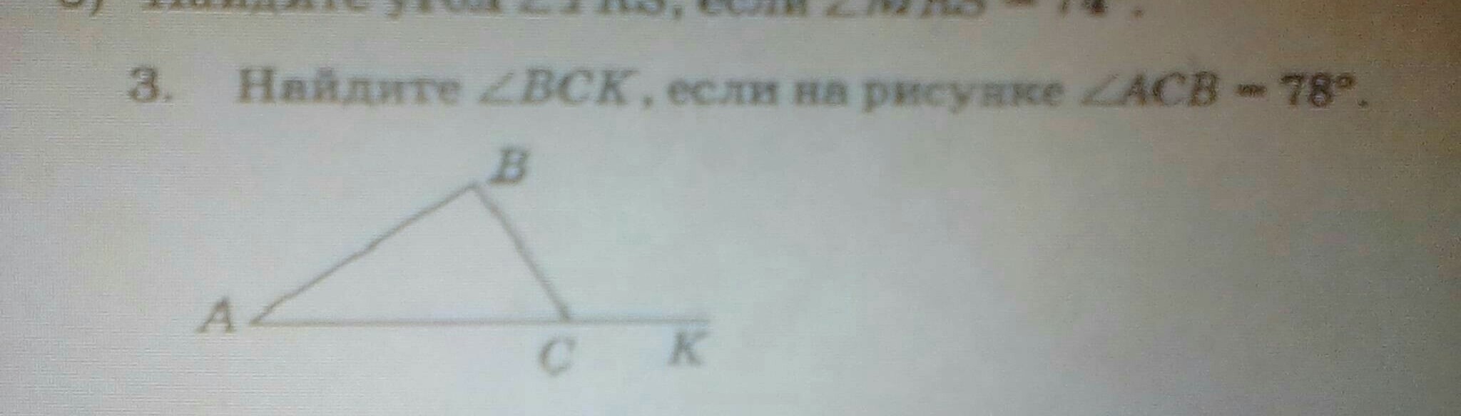 углы ACB и BCK - смежные. Сумма смежных углов равна 180° => угол BCK = 180° - угол АСВ = 180° - 78° = 102°.