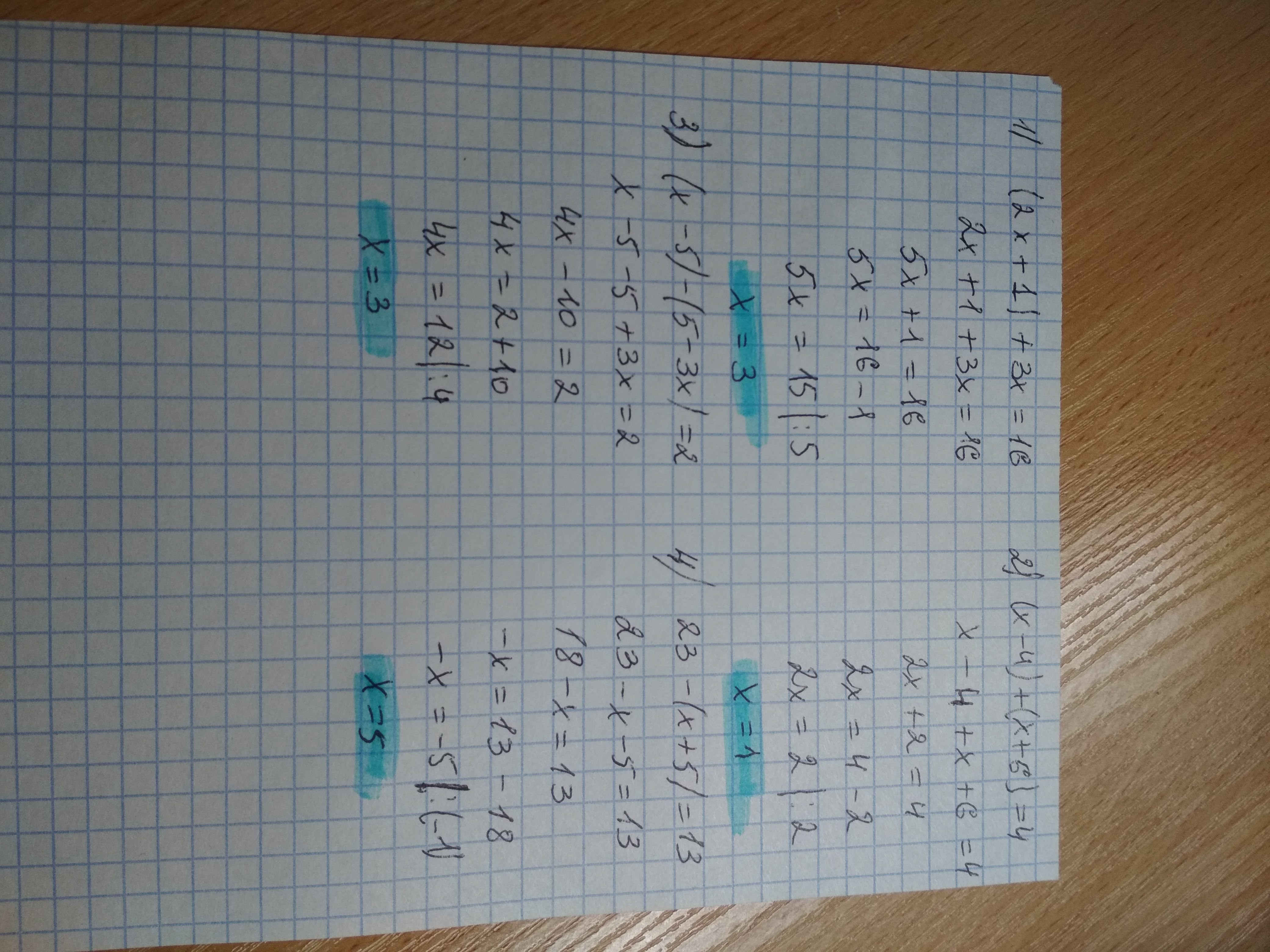 Помогите пожалуйста. Решите уравнения: 1) (2x+1)+3x=16; 2) (x-4)+(x+6)=4; 3) (x-5)-(5-3x)=2; 4) 23-(x+5)=13.
