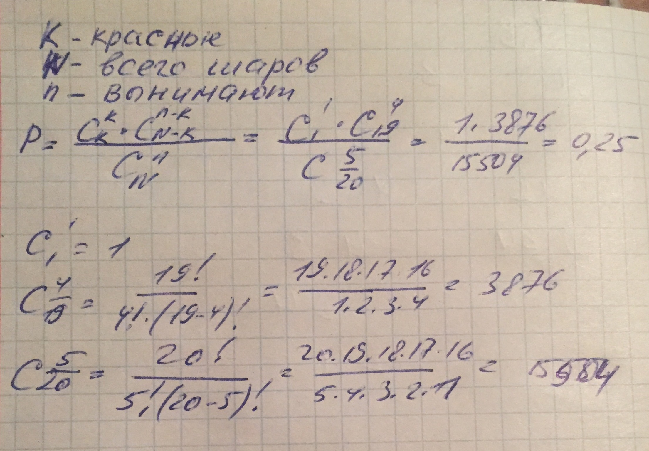 В коробке лежит 20 шариков, только один из них красного цвета. Из коробки наудачу достают 5 шариков. Найти вероятность того, что среди них окажется красный шарик.