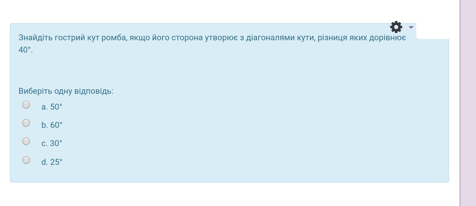 Диагонали ромба являются биссектрисами углов ромба, так как угол 30 то он является половиной острого угла ромба, тогда весь угол равен 60°. В пункте б) угол 50° это половина тупого угла, весь угол 100°. Так как сумма углов прилежащих к одной стороне равна 180° тогда острый угол ромба 180-100=80. Я, конечно, удивлён ведь это все очень просто.