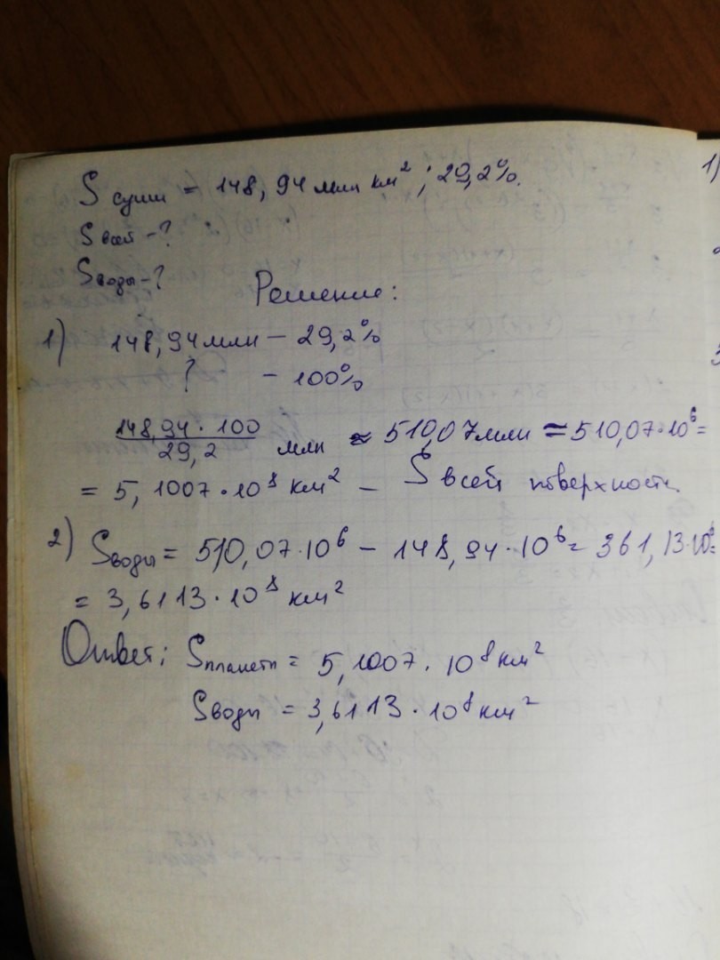 Ответы должны быть 5,1007×10^8 км^2; 3,6113×10^8