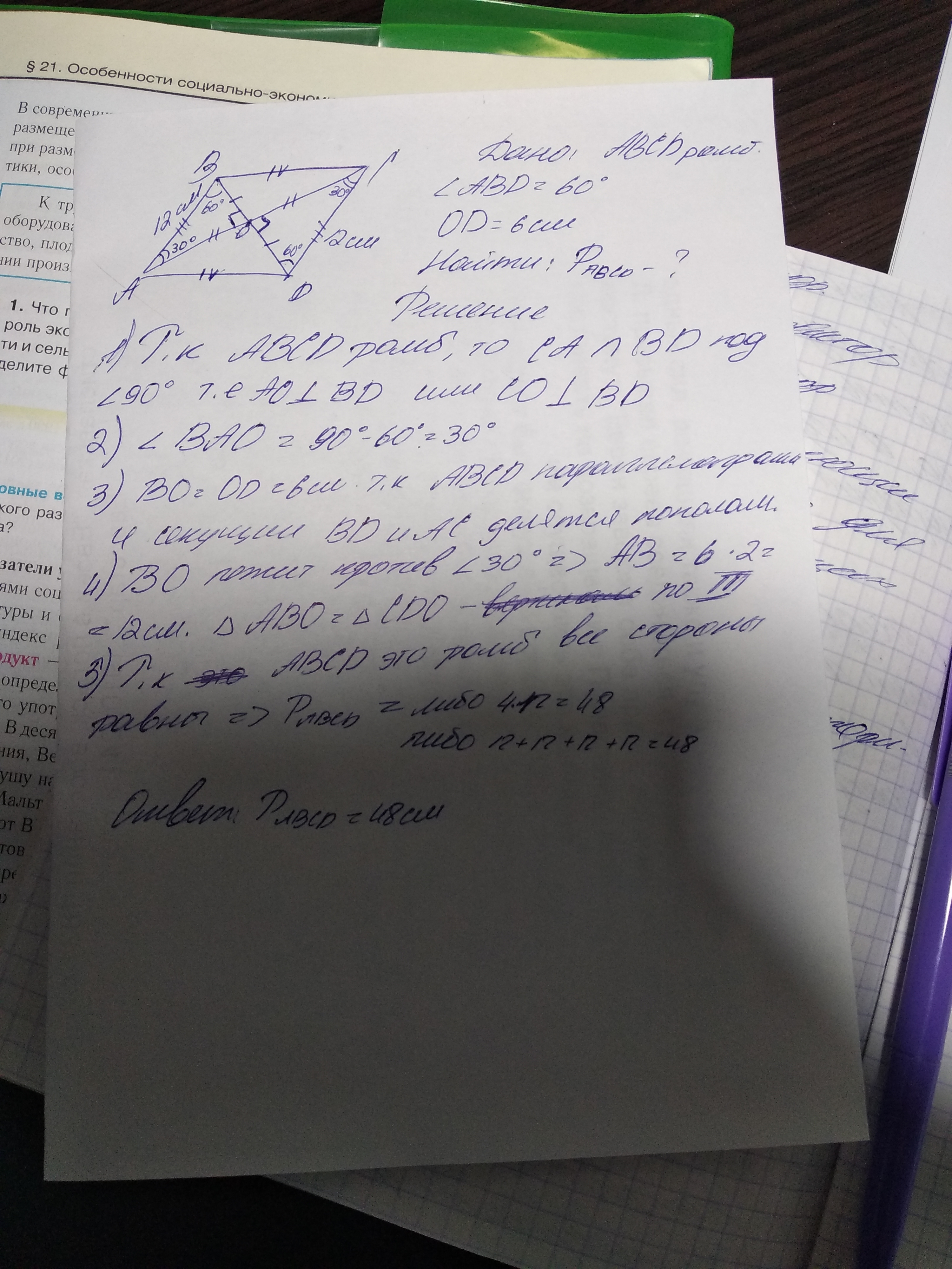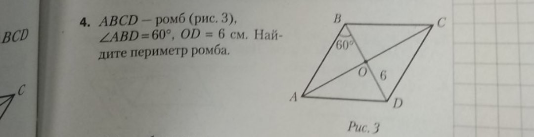 Крч, в 4 задании там BD диагональ, и OB = DO = 6см. Потом CD = 6•2=12см = BD = 12см.Тогда и BC = 12см и 12•4=48см периметр. Не благодари <3