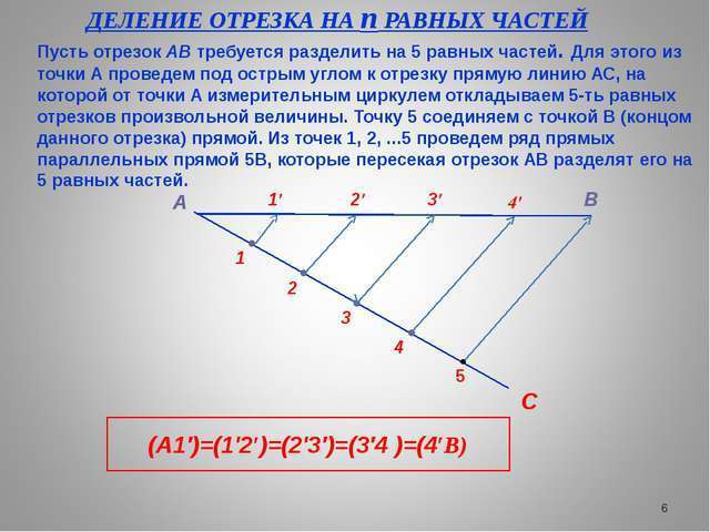 Разделить прямую AB на 5 равных отрезков, при помощи циркуля и линейки. Описать ход построения ( действия с помощью которых делили)