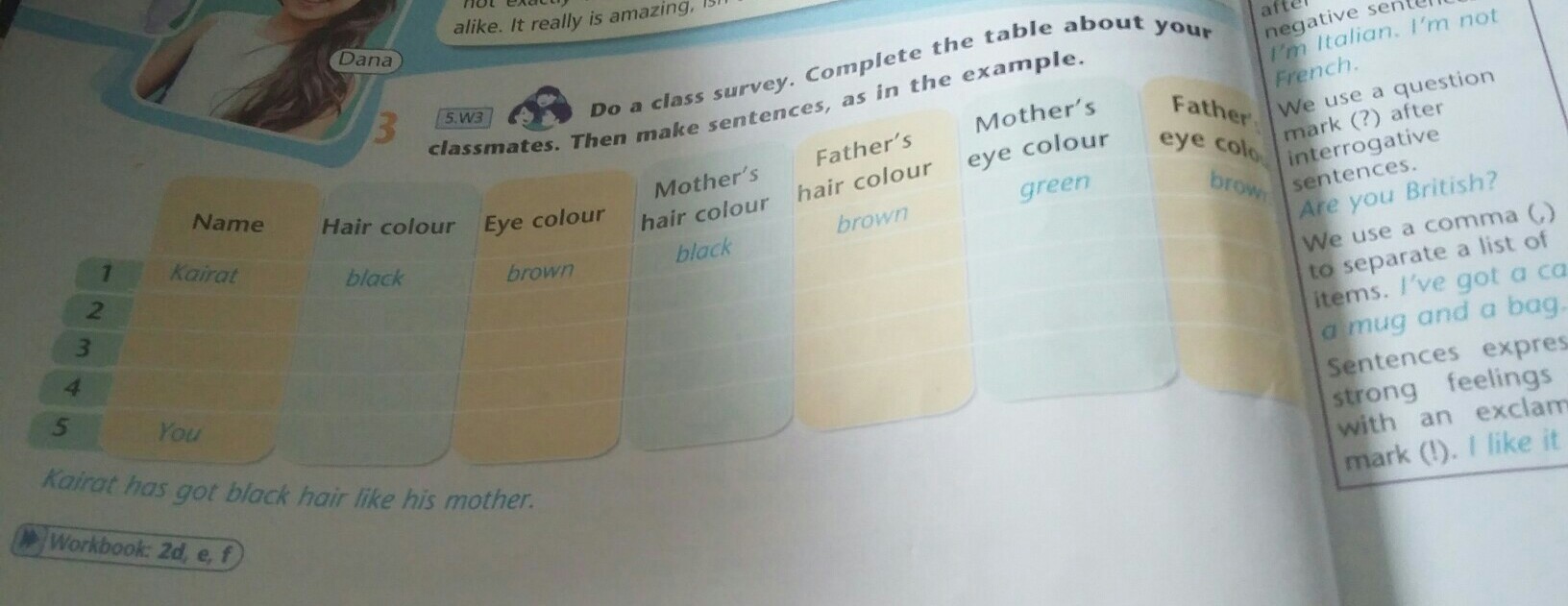Пишем несколько имен одноклассников и описываем их по таблице.Потом составляй предложения.