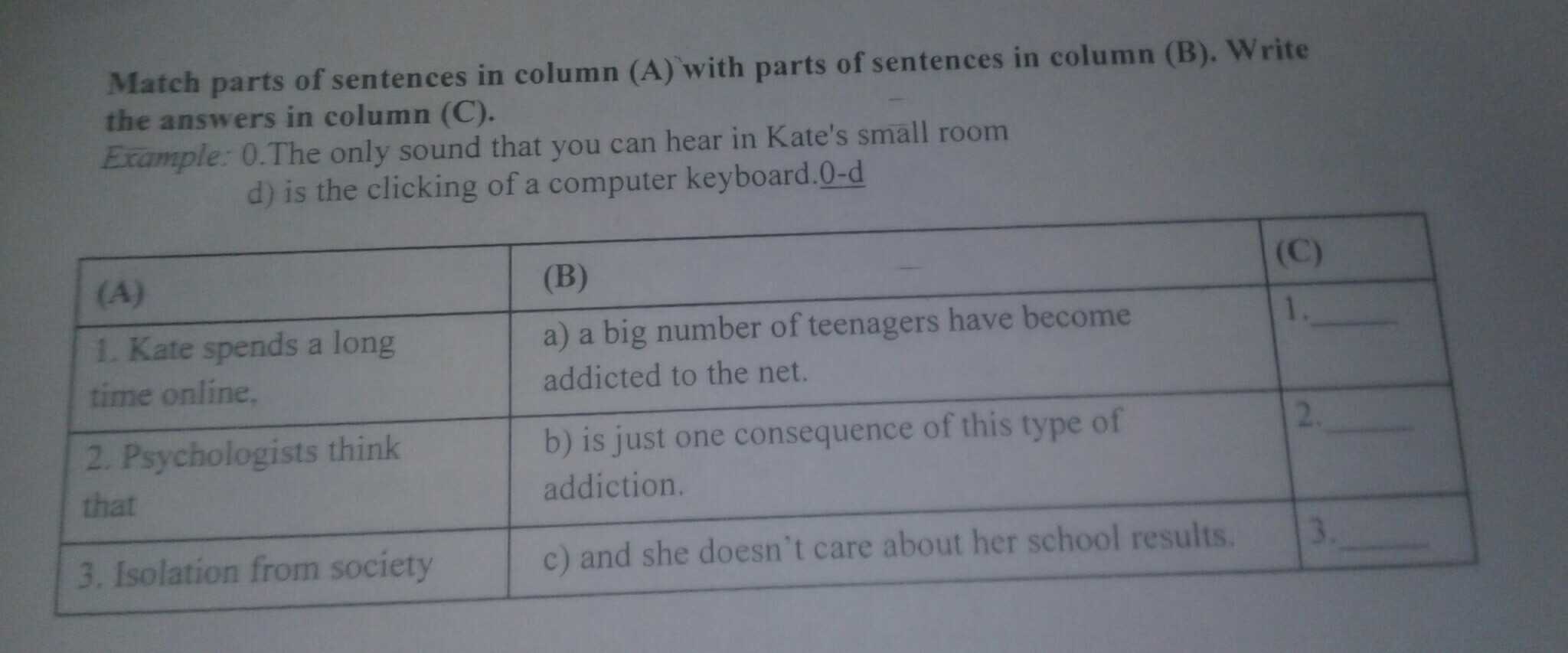 Match parts of sentences in column A with parts of sentences in column B. Write the answers in column C.