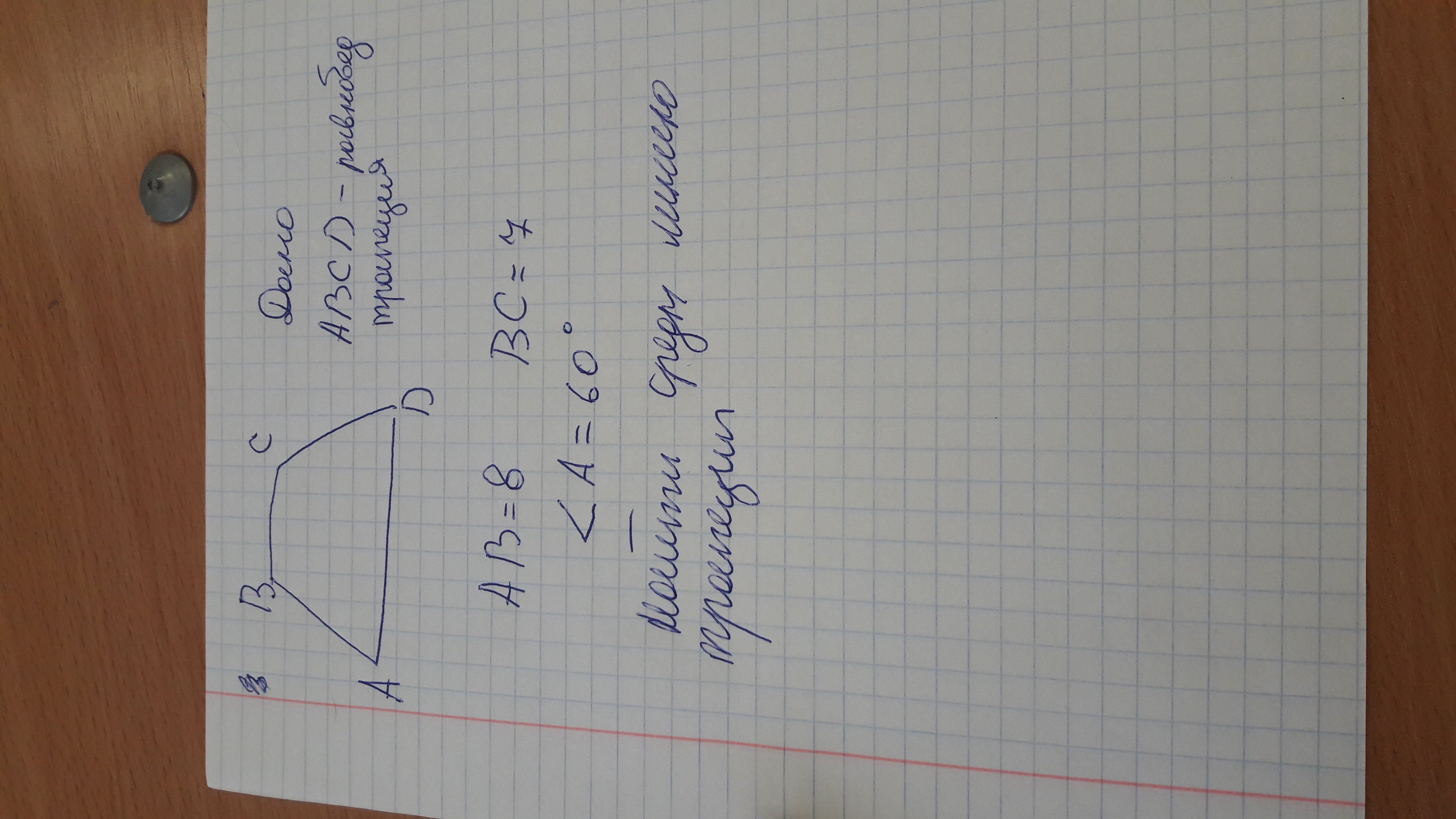 Проводим высоту ВН. Она образует прямоугольный треугольник. Один угол равен 60, прямои угол равен 90. Значит угол ван рааен 30. Находим основание треугольника из теоремы о катете противолежащем 30 градусов. Основание треугольника равно 8/2 это 4 см. Основание трапеции равно 4+4 это сумма основания двух треугольников и +4 это сумма верхней стороны трапеции. 4+4+4 равно 12см.