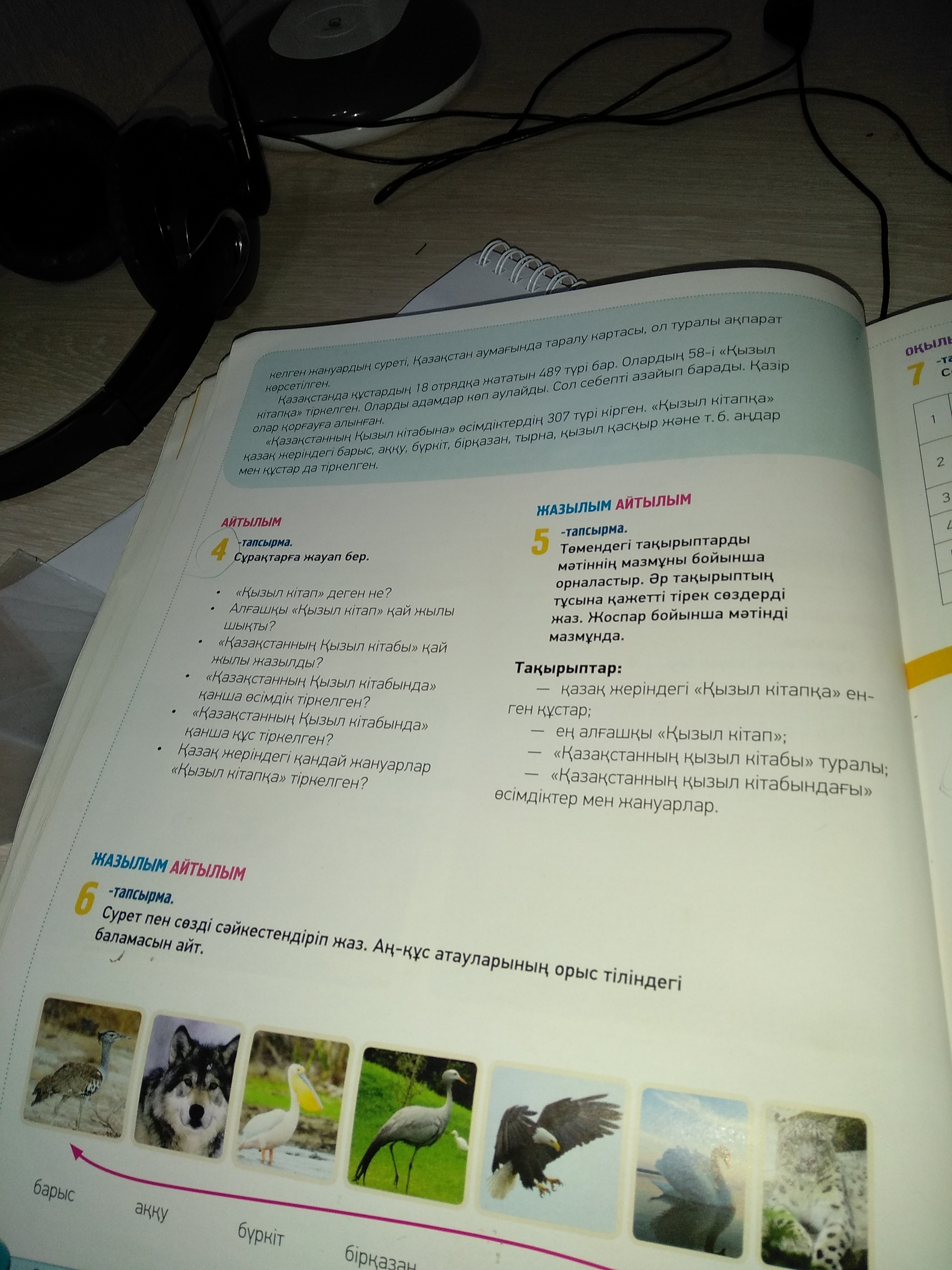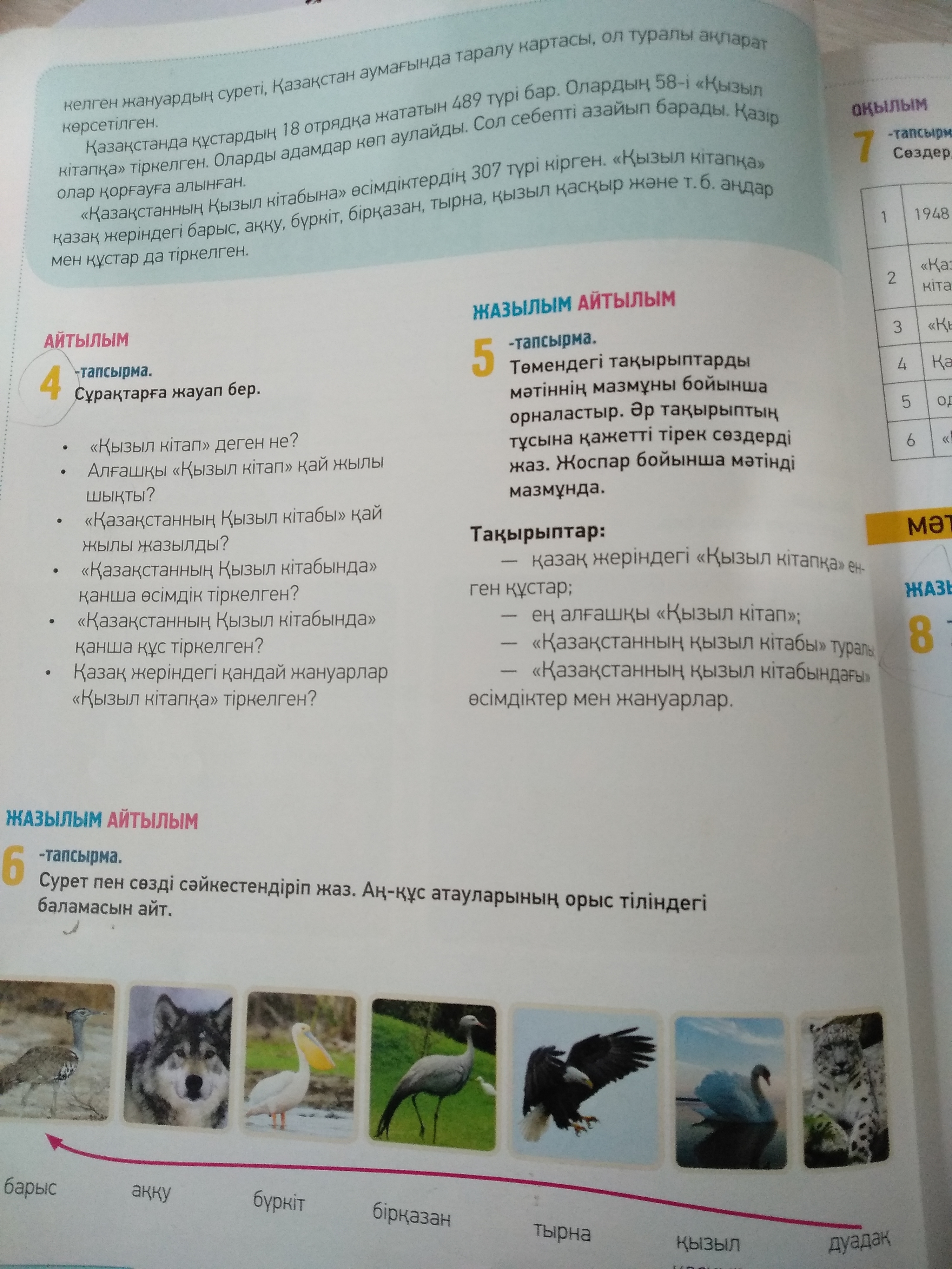 6)"Қызыл кітапқа қазақ жеріндегі барыс аққу бүркі Ерқазган тырна қызыл қасқыр