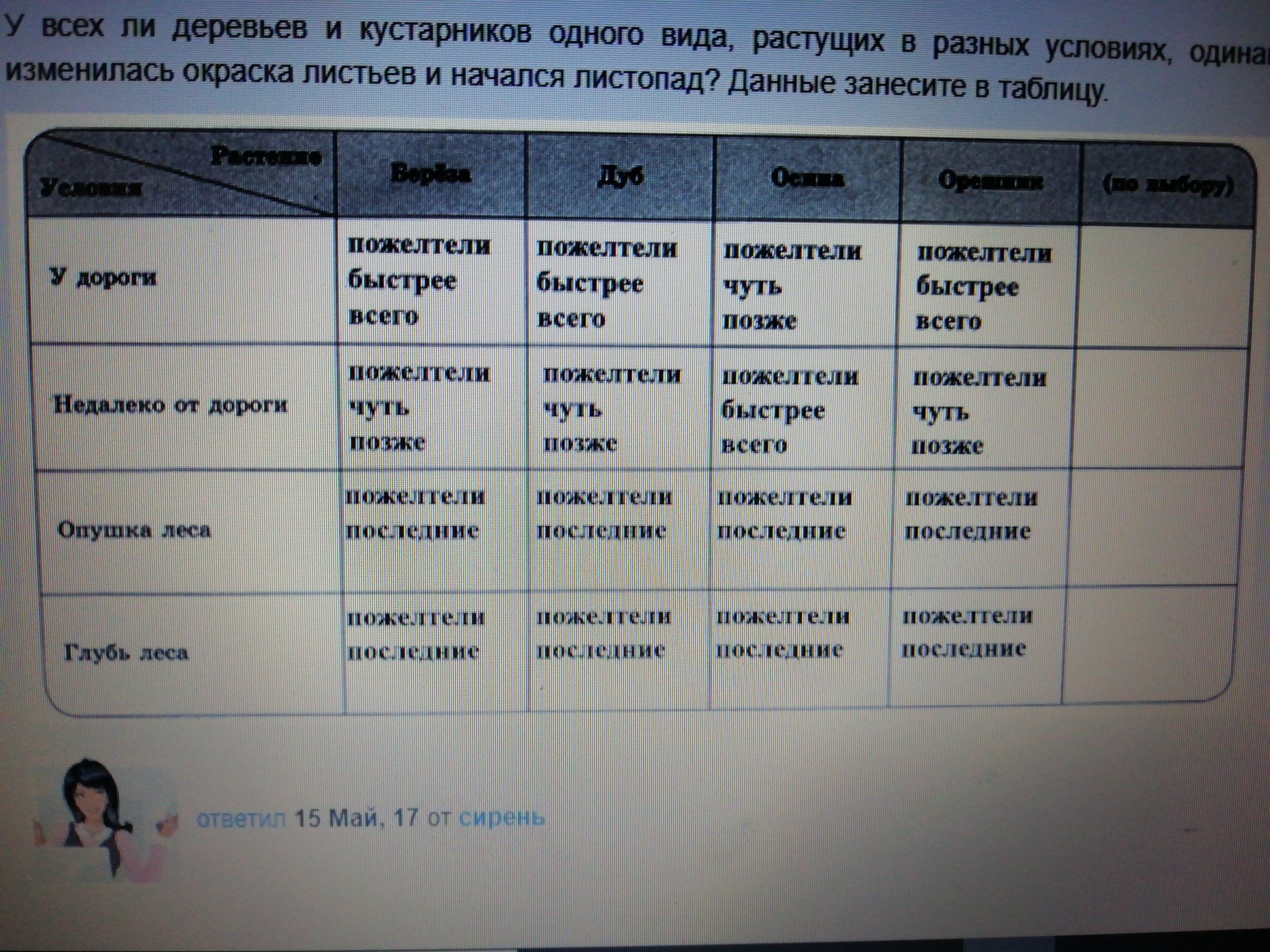 и начался листопад? Данные занесите в таблицу. Условия: 1. у дороги 2. недалеко от дороги 3. опушка леса 4. глубь леса Растение: Береза тополь Осина лиственица