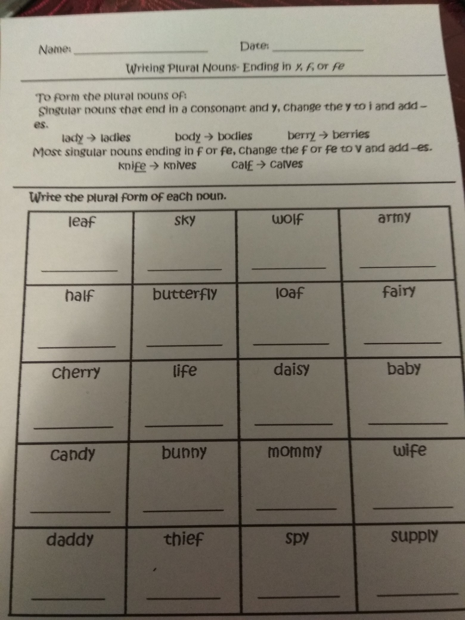 Leaves,skies, wolves,armies, halves, butterflies, loafe, cherries,life’s ,daisies, babies,candies,bunnies, mommies, wifes,daddies, thieves, spies, supplies